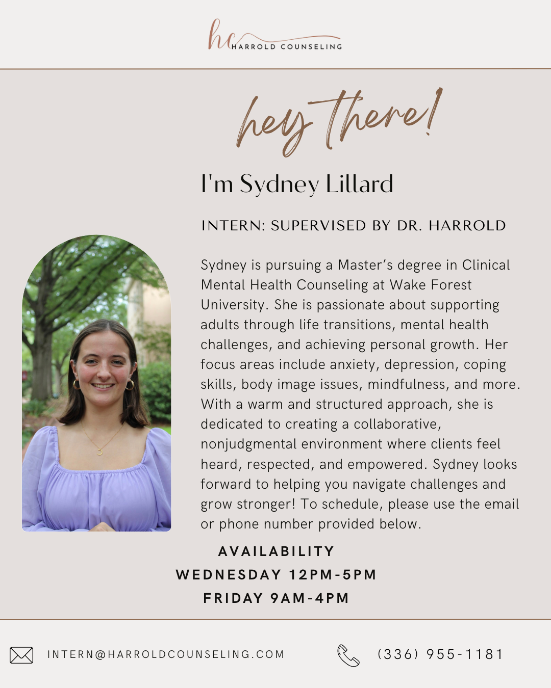 Haley received her BSW from UNCG and then went on to receive her MSW from the advanced standing JMSW program at UNCG and NCAT in 2012. She is a Licensed Clinical Social Worker and has her Certified Greif Informed Professional certification (LCSW and GCP). Haley enjoys working with people of all ages and backgrounds. She has worked in outpatient therapy with children, families and individuals of all ages. She has a history of working in the emergency department for crisis behavioral health concerns as well as outpatient therapy in a health care setting. Her areas of interest include but are not limited to anxiety, depression, grief, adjustment disorders among other disorders. Haley enjoys person-centered care using an eclectic use of different models. Haley works hard to ensure a comfortable safe space for any person to feel welcome. Everyone's story is important, sometimes sharing yours will make all the difference.